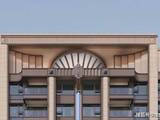 外立面以浅米色为主色调,笔直线条搭配局部弧形转角的金属外框、玻璃倒映着天光云影,宛如一幅幅流动的艺术油画。精致挺拔的弧形塔冠设计,让建筑颇具识别性,打造浦江新的天际封面。