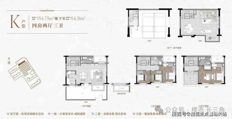 一楼和地下室主社交和志趣,二楼是子女的房间,三楼是主人休憩区。
