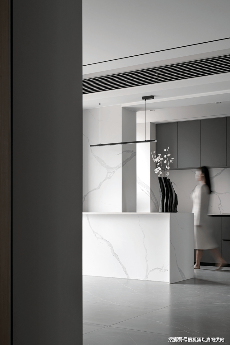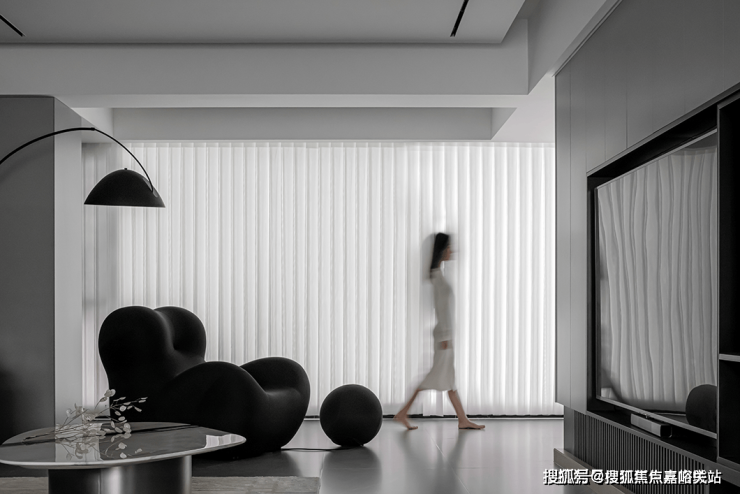 The open layout throughout the design has thrown away the shackles of traditional closure, so that each functional area naturally integrates with each other. Black shaped sofa like a dynamic melody, injected the vitality of the space, its many convex design, but also fit the body curve, for the residents to bring comfortable experience.