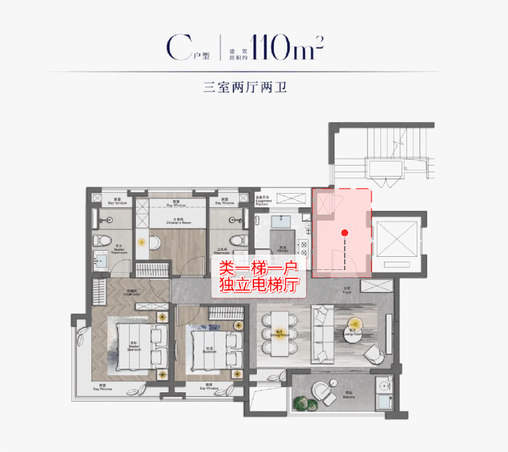 第三,建面约110㎡3房是类一梯一户的居住体验,享受独立电梯厅!