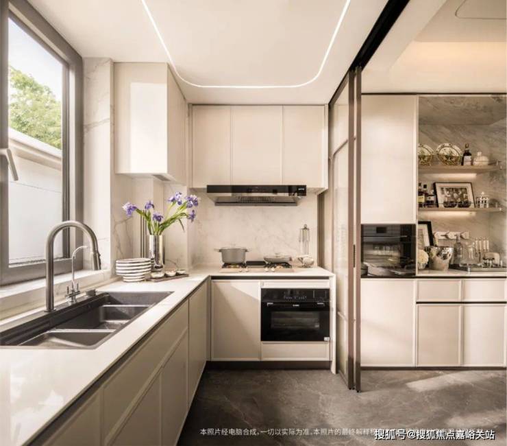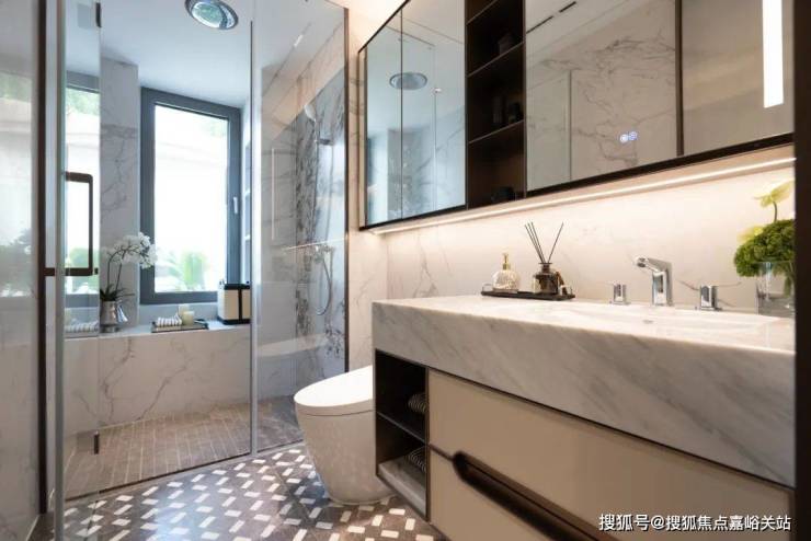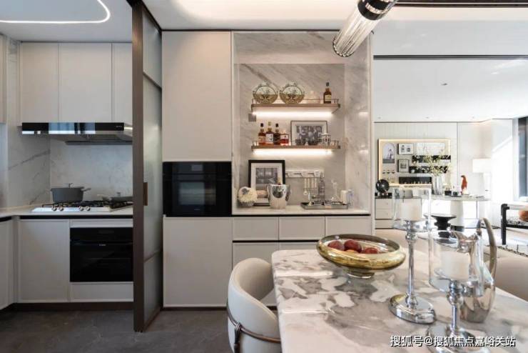 此外,归家门厅墙面石材镶嵌意大利毕加索奢石,地面大理石水刀海派拼花,及厨房和餐厅中间用无地面链条设计的海派金属玻璃移门隔开,方便地砖通铺...种种 匠心细节 ,无不印证西派海上打造张江标杆的决心。