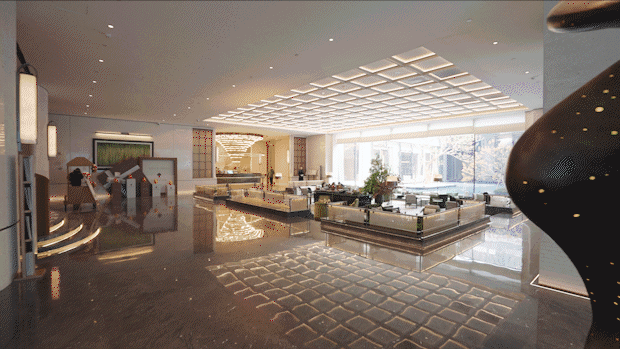 门厅上:采用高奢酒店“环岛式”落客流线,配有胡栋民先生操刀,从约1500公里外臻选的汉白玉整石雕琢而成的《海·回声》,墙面、地面采用奢石铺就。