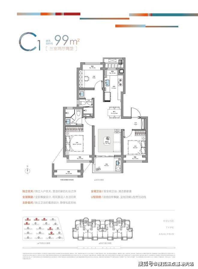 建面约99㎡B户型客餐厅配置超大尺度横厅,全卧室飘窗就连主卫也配置了一个飘窗;
