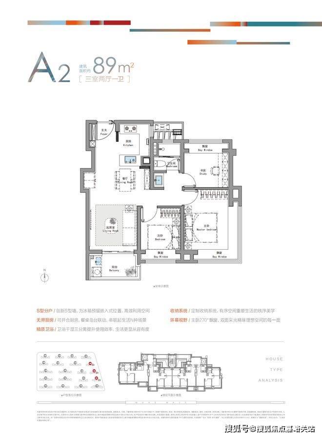 建面约89㎡3房东边套主卧配置约270°双向采光飘窗、S墙设计;