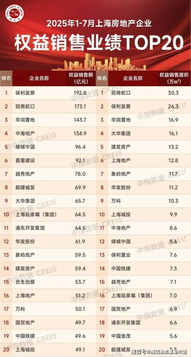 2025年1-7月,上海房地产权益销售业绩TOP20企业合计销售1659.6亿元;权益销售面积TOP20企业合计销售229.4万平。权益销售额突破90亿元的房企有6家,其中保利发展、招商蛇口、华润置地分别以192.8亿元、173.1亿元和143.7亿元获得销售金额榜前三名;权益销售面积榜中,招商蛇口、保利发展、华润置地分别以30.3万平、26.3万平和16.9万平获得前三名。