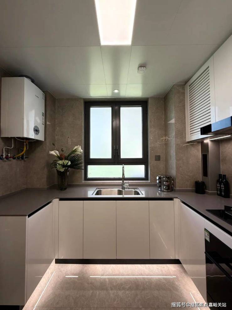 厨房使用科勒(或同等品牌)厨盆、厨盆龙头,使用起来更加方便;更有定 制橱柜、石英石台面,美观耐用的同时也方便日常清洗。厨房墙砖、地砖、吊顶都是统一色调,非常美观。
