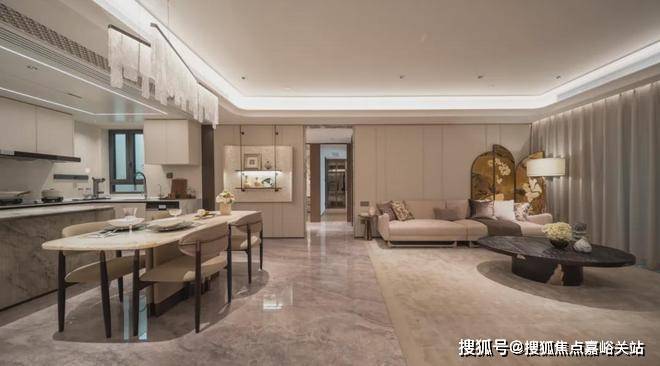 客餐厅方面, 电视背景墙采用卡慕白石材+皮革,均为交付标准;地面采用简一(或同等品牌)的 900*1800仿石砖,密拼施工,几乎看不到有任何缝隙——相信有装修经验的小伙伴一定知道,这种大砖的价格和这样的密缝工艺成本有多高!