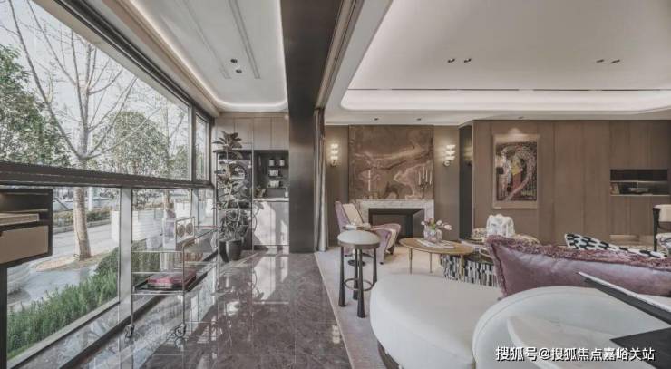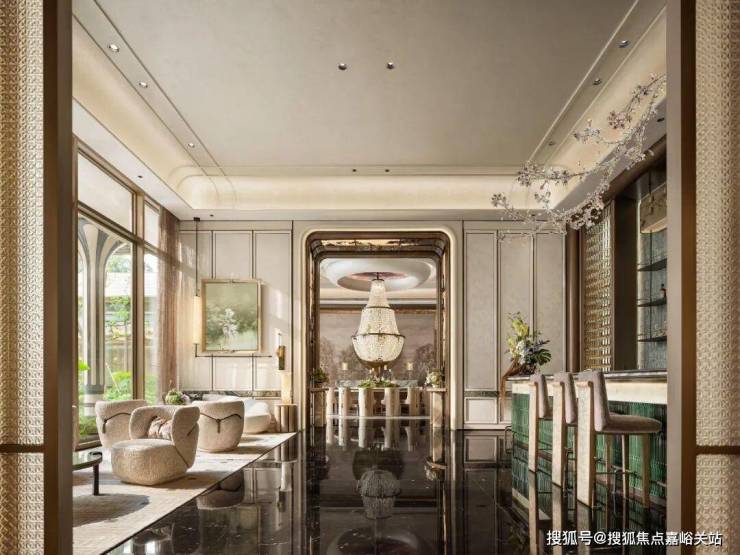 首先是奢石含量极高,从入户处的玲珑玉拼花与透光云石辉映,到翡翠绿奢石墙景、再到发光云石装饰点亮归家路,石材的典雅贯穿始终。