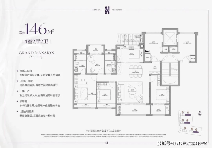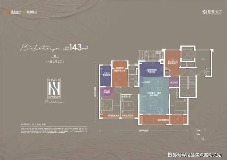 建面约143㎡的4房户型, 类一梯一户的设计,每一户都有一个面积约8㎡的独立采光电梯厅空间;四开间朝南+大宽厅,采光效果爆棚;通过LDKB一体化设计,形成一个近50㎡的客餐厅空间,极大提升空间场景的可能性;卧室也采用了酒店化套房设计,主卧贯穿南北套房设计,南北皆有飘窗。