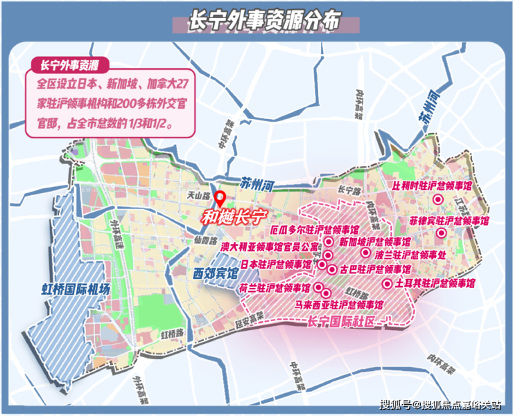 “外事客厅”的独一份定位,离不开长宁独一份的国际交通枢纽优势。作为 全上海仅有与虹桥机场、高铁站“双枢纽”直接接壤的城区,其核心区域通过轨道交通、快速路网构建起 “15分钟国际通勤圈”。