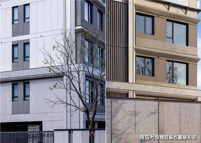 整体外立面以 浅色香槟铝板线条、深色香槟铝板窗套搭配暖灰色真石漆 ,配色更具活力。