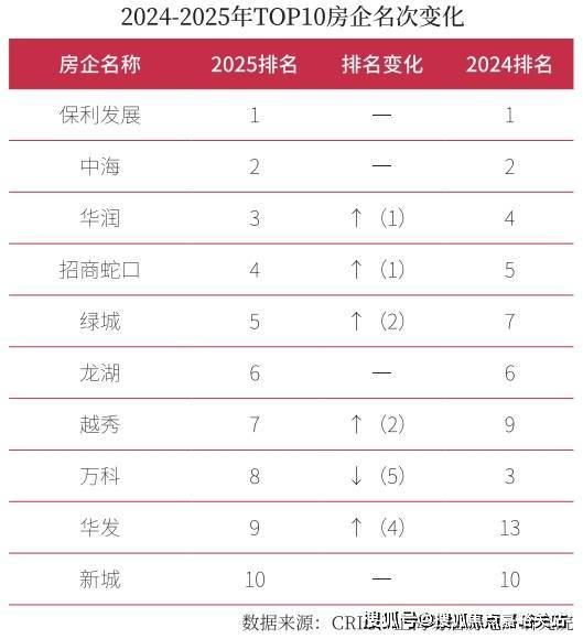 测评研究报告显示,2025房地产开发企业综合实力TOP500前三位由保利发展、中海、华润占据。其中,保利发展、中海分别保持第一、第二位,华润上升至第三位,招商蛇口、绿城、龙湖、越秀、万科、华发、新城分列第四至第十位。