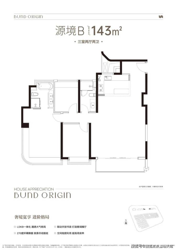 B户型是3房2厅2卫格局, 三开间朝南+LDKB一体化+奢阔宽厅+全卧室带飘窗+主卧套房设计+动静分离+主卧270度飘窗,舒适度更高。 中建壹品外滩源著售楼处电话:400 - 8894 - 986😽😽