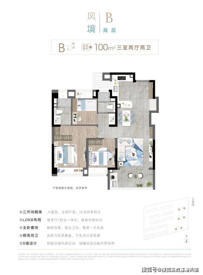 金地嘉境售楼处电话4008569058☑️☑️建面约100㎡3房:三开间朝南+南北通透+双卫设计,充分满足刚需置业两代人的生活需求!LDKB一体化设计,为家庭交互提供全新场景,将空间更大化利用!金地嘉境售楼处电话4008569058☑️☑️