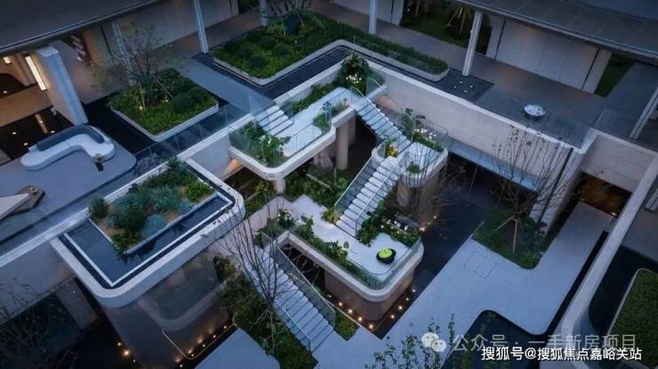 四层悬浮岛屿式阶梯,借鉴全球十二大奢华酒店之一的迪拜丽晶公寓,每一个观景露台都种植着不同的植被,一步一景。