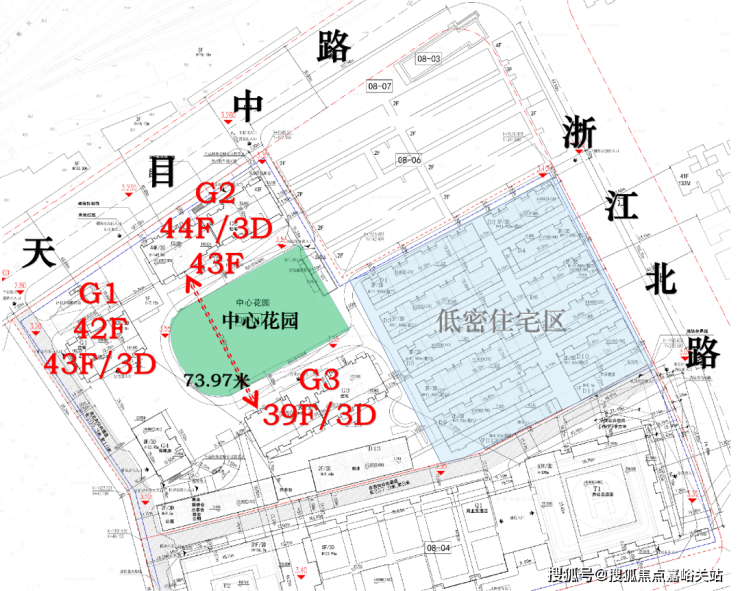 08-01地块设计了G1、G2、G3三栋超高层住宅,分别为39-44层不等;另有低密住宅地块。