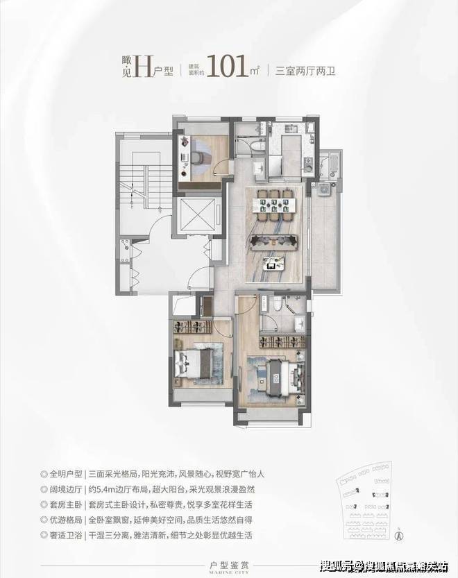 华发海上都荟售楼处电话☎:400-8854-706✔✔✔(温馨提示:本项目参观样板间采取预约制,为了不耽误您的行程,过来参观请提前来电进行预约看房或咨询项目详情)③建面约101㎡H户型:三面采光,全能景观王炸边厅户型!同样是3房2卫的配置,功能性与舒适度兼具。该户型惊艳的地方在于大尺度的景观边厅设计,搭配超大阳台,营造IMAX级别的客厅景观面,极具阔绰感! 全卧室飘窗、干湿三分离、U字型厨房设计,同样的魔鬼细节!华发海上都荟