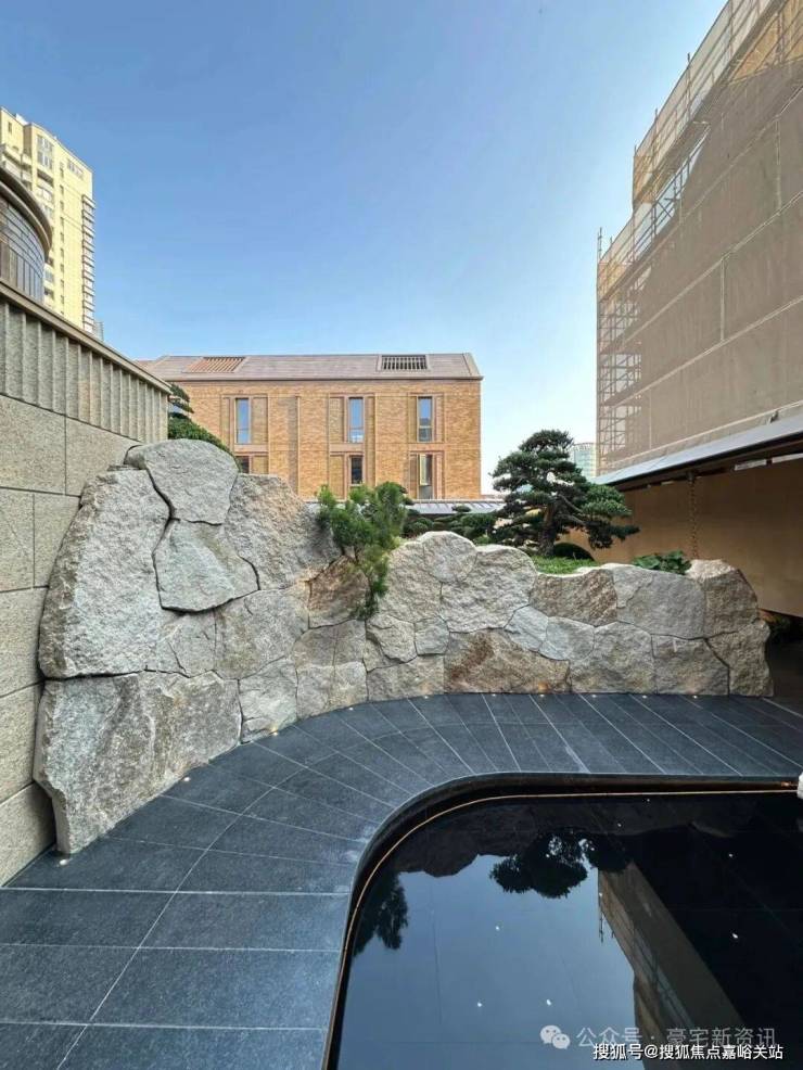 山水庭院汲取《足立美术馆》的造境手法,以老石皮、百年古木原样搬运,重现山间岁月的自然痕迹,与庭院中的光影交织,仿佛将山间的自然采光与静谧之感搬入城市。阳光透过树梢洒落,石皮上的纹理在光影中若隐若现,宛如一幅流动的自然山水画卷。