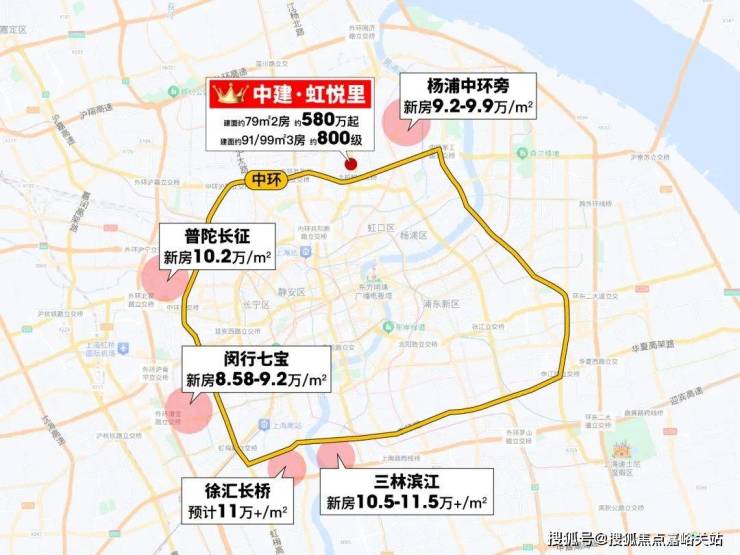 同环线普陀长征新房均价 10.2万/㎡;闵行七宝也已 8.58-9.2万/㎡。