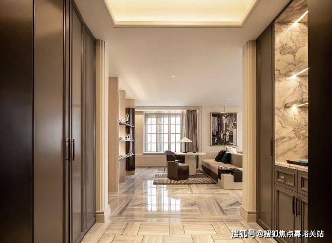 进入室内的入户玄关收纳空间,地面采用静雅棕、宝格丽兰石材拼花设计古典回形波打+实心铜条的搭配增强入户尊贵感。右侧是山水白奢石的开放格,左侧是行李间,通过暗门的做法,将功能结合进去,强化了归家的仪式感。
