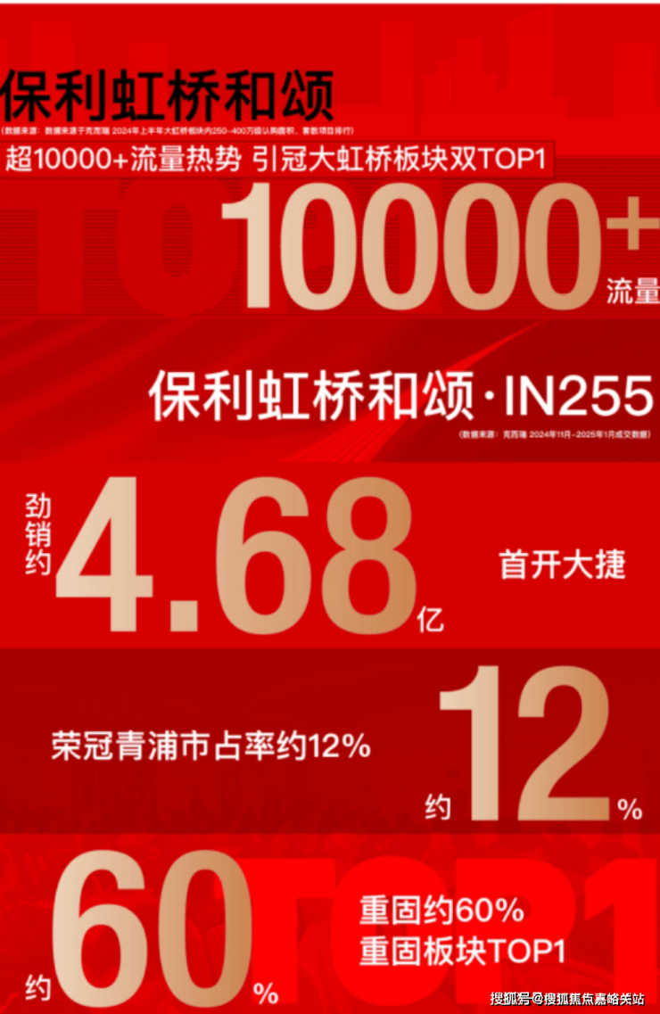 青浦板块【保利虹桥和颂】以开篇者之姿,一举打破板块沉寂, 凭借10000+人次现象级到访流量实力出位。继首作破局,战略纵深再落关键一子, 【保利虹桥和颂.IN255】首开即强势斩获 4.68亿元业绩,更以单 盘青浦约12%、 重固板块约60%市占率,给出了城市立新的标准答案。(数据来源:克而瑞2024年11月﹣2025年1月成交数据)