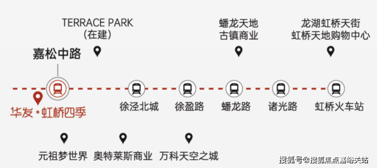 华发虹桥四季周边商业氛围浓郁,形成了一站式繁华商业圈。距离项目直线距离约 700 米左右的 Terrace Park 日式商业(在建,即将开业),作为 “Terrace Park” 购物中心品牌在国内的首店,拥有约 5.5 万平方米滨水商业休闲空间,未来将融入流行餐饮、时尚购物、影院健身、亲子娱乐、活力零售、智能科技、屋顶运动公园等多元商业服务,为居民带来全新的消费体验。直线距离约 1 公里处的青浦奥特莱斯商业中心,占地面积约 16 万平方米,辐射整个长三角,汇聚了二百五十余家商铺、四百五十多国内外潮流与奢侈品牌,每逢节假日,消费人群熙熙攘攘,热闹非凡。还有约 7000 平的儿童职业体验馆、可容纳 300 人的儿童演艺厅、音乐艺术健体等培训中心以及约 5000 平的户外训练营、屋顶宠物乐园 (马场)、开心农场等亲近自然的活动场所,满足女性、儿童和亲子家庭的各类需求。此外,地铁上盖商业如万科天空之城(17 号线 2 站地铁徐盈路站)、蟠龙天地古镇商业(17 号线 3 站地铁蟠龙路站)、龙湖虹桥天街 / 虹桥天地购物中心(17 号线 5 站地铁虹桥火车站)等,进一步丰富了居民的购物娱乐选择,让繁华触手可及。