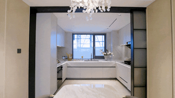 厨房与餐厅采用开放式布局,U型台面让洗-切-炒动线形成闭环,洗菜区、备餐区、烹饪区呈三边分布,形成高效洄游路径。