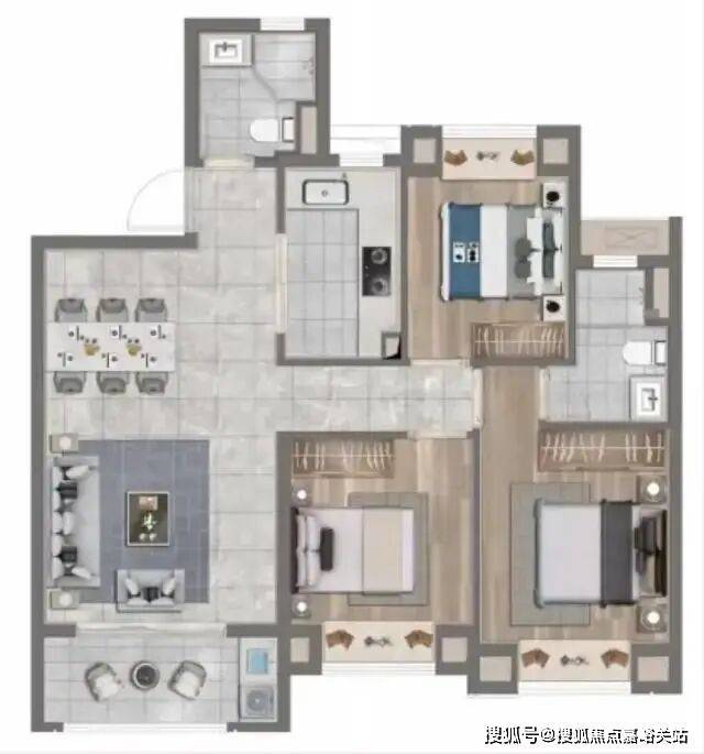 建面约96㎡做到了3房2厅2卫,改善入门级户型, 三开间朝南+主卧套房设计+南北通透+动静分离 ,室内功能空间布局非常合理。