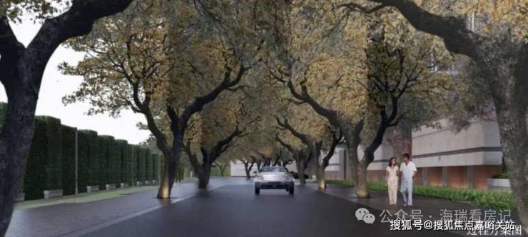 比如,规划道路上的香樟树,要选择合适的树龄与尺寸,项目花了数月才找到10棵合格的。围墙间隔的紫薇树,也是千挑万选而来~