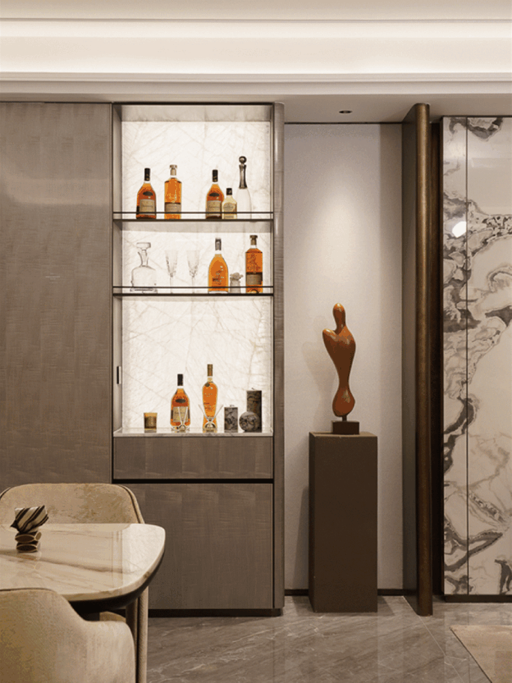 145平的大户型,入户就是一组800库,约80厘米进深的储藏空间。 酒柜 以及对面转角处的一套 餐边柜 ,也是交付标准。