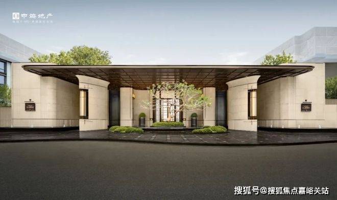 项目的主入口,门头承袭玖字理念,约55m横向尺度与约7m纵向高度,高于传统的约4m高景墙,搭配通高陈列的全石材柱体,恭迎业主归家。
