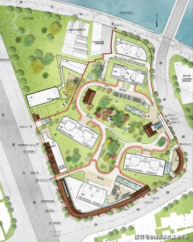 项目构建了多层次景观体系:超高层高区可远眺黄浦江与陆家嘴天际线;中区可俯瞰苏州河景;低区则通过建筑围合出近3000平方米的中心花园,并与毗邻的九子公园景观渗透,增强了空间景深。社区内部以“水为径、形为礼、园为厅”的理念,营造可观、可享、可居的海派生活场景,确保高、中、低区住户在不同高度皆享有独特景致。