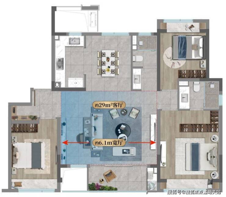 国印东方125㎡户型拥约6.1米宽尺开间,客厅面积高达29㎡,连接同等面宽的跑道级阳台,可自由设置书房、琴房、茶室等,兼容全家生活需求。