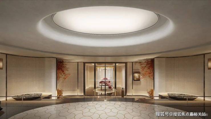 约32米气派门厅,入口采用三重弧形石材墙体+圆角幻彩穿孔顶,四重酒店式归家厅堂,让每一次归家都充满仪式感。
