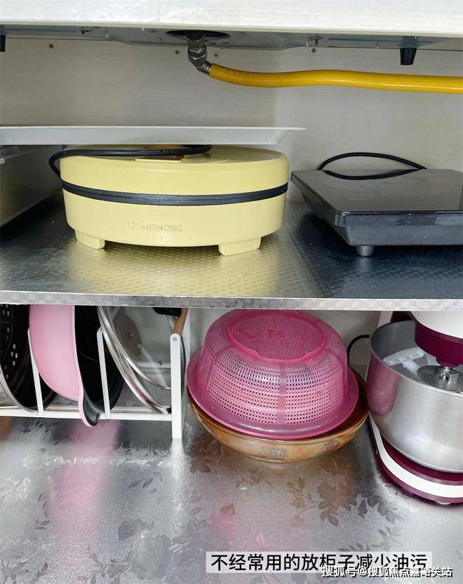 像是饼铛、电磁炉这类不常用的餐具,也都放在了灶台下方的底柜里,留有缝隙方便拿取,用的时候不用再翻找。