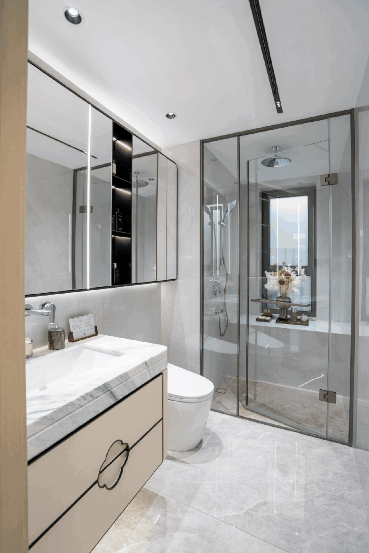 卫生间台面则选用 石材,进一步提升空间精致度。