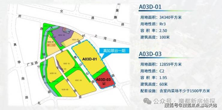 A03D-01地块: 出让土地面积34340平方米,土地用途为普通商品房,规划容积率2.5,计容建筑面积85850平方米。