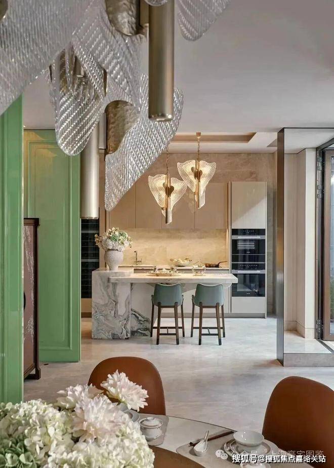 开放式布局消弭功能边界,大理石的冷冽肌理与皮革温润形成理性对话,金属线条勾勒出老城厢砖瓦的抽象轮廓,完成一场跨越时空的材质碰撞。