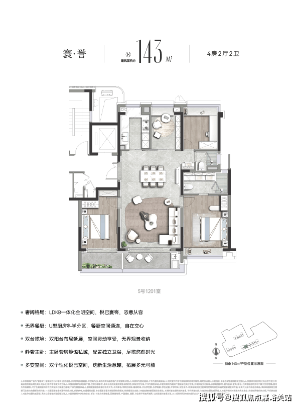 预算充足的改善家庭,还可选择 约143㎡4房户型。作为 内环内稀缺的控总价4房,它在尺度与舒适度上颇为出彩: