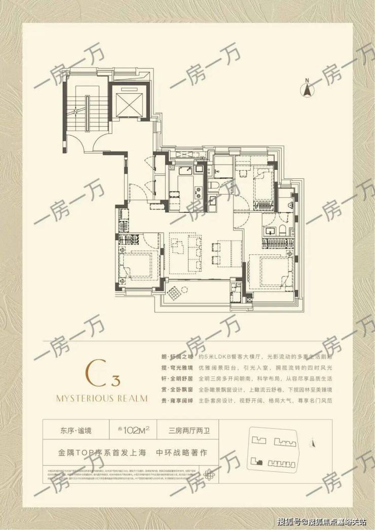 同样的设计巧思应用于约102㎡样板间(三房两厅两卫),打造出近乎双套房的生活体验。