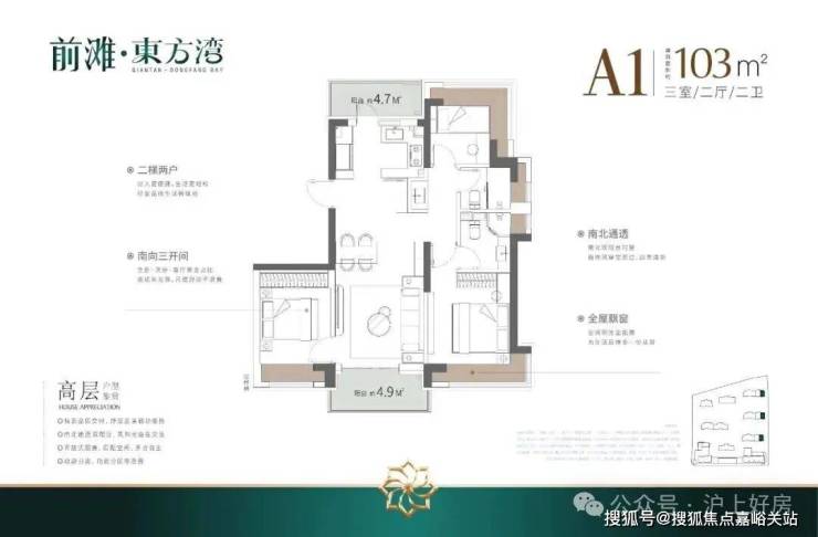 建面约120㎡大3房预计主力总价在900-1050万,一梯一户设计+约6.7㎡私享电梯厅+南北双阳台,质价比拉满!