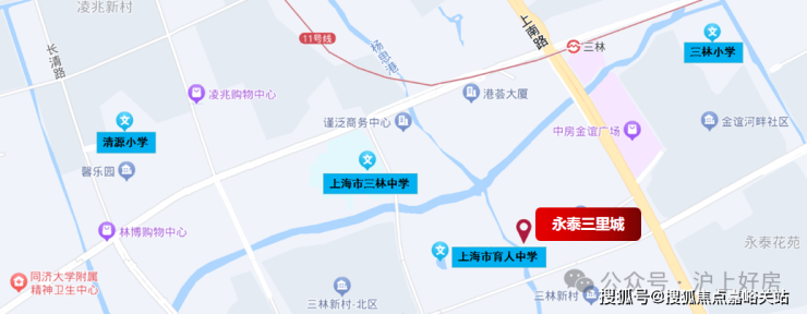 轨道交通方面: 项目距地铁11号线三林站直线距离约500米,临近中环路和外环高速,交通十分之高,几乎可以畅达整个上海市各个交通节点。