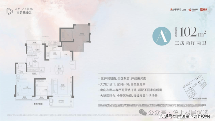A户型是建面约102㎡3房2厅2卫,该户型 三开间朝南 , 采光效果上佳。 大方厅设计 ,空间开阔自由度更高。南向次卧和客厅可灵活打通,适配不同家庭所需; 大进深阳台+全景落地窗 ,让室内的通透性和视野可圈可点。