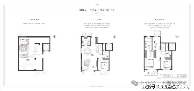 上叠:实现 2+1房2卫 设计,长辈房位于三层、配卫生间,规避上下楼梯的麻烦。 南向阳台与餐客厅一线贯通 ,享受充沛阳光。 四层豪华主卧、北侧连接露台, 空中露台及顶层阳光平台,可量身定制成一方幸福天地。