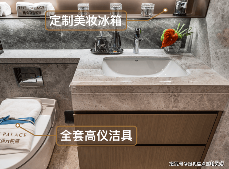卫浴空间同样精彩,采用高仪的台盆、龙头、智能马桶、淋浴花洒等,主卫创新定制“美妆冰箱”,满足业主对美妆、护肤用品冷藏的需求,足见开发商对成本的舍得。