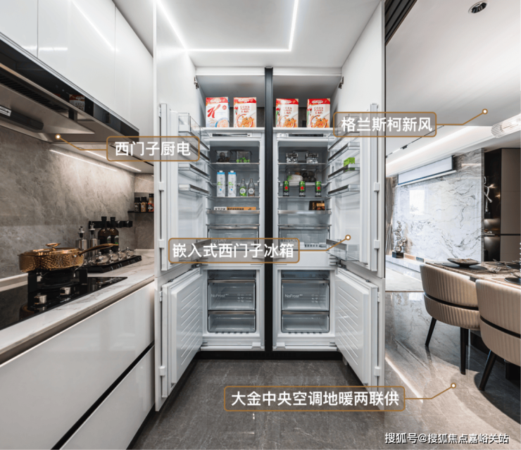 厨房空间,甄选西门子新款的抽油烟机、灶具、洗碗机等,甚至连大部分项目不配备的冰箱也是交付标准;还特别配置了轨道插座、前端净水器和凉霸;吊轨金属玻璃移门,既美观又方便清理。