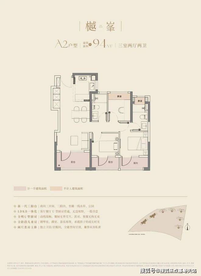 大华望樾的高层建面约94㎡户型做到了三阳台的配置;
