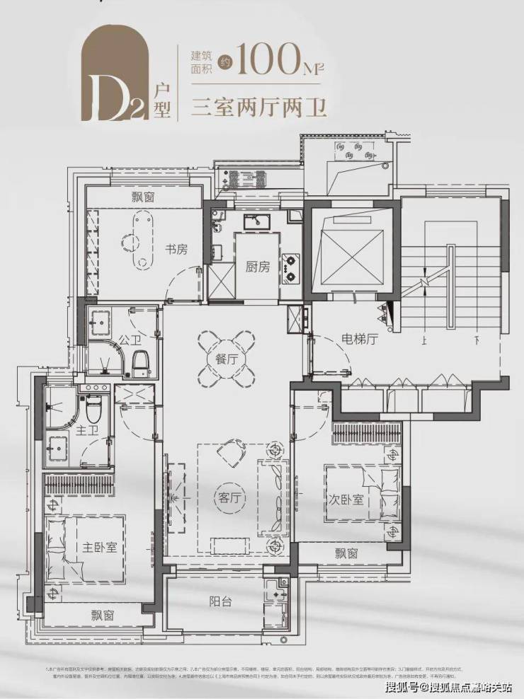另一套建面约100㎡飞机户型,同样做了三房两卫,户型方正,几乎无过道设计,每一寸空间都没有浪费,舒适不局促。
