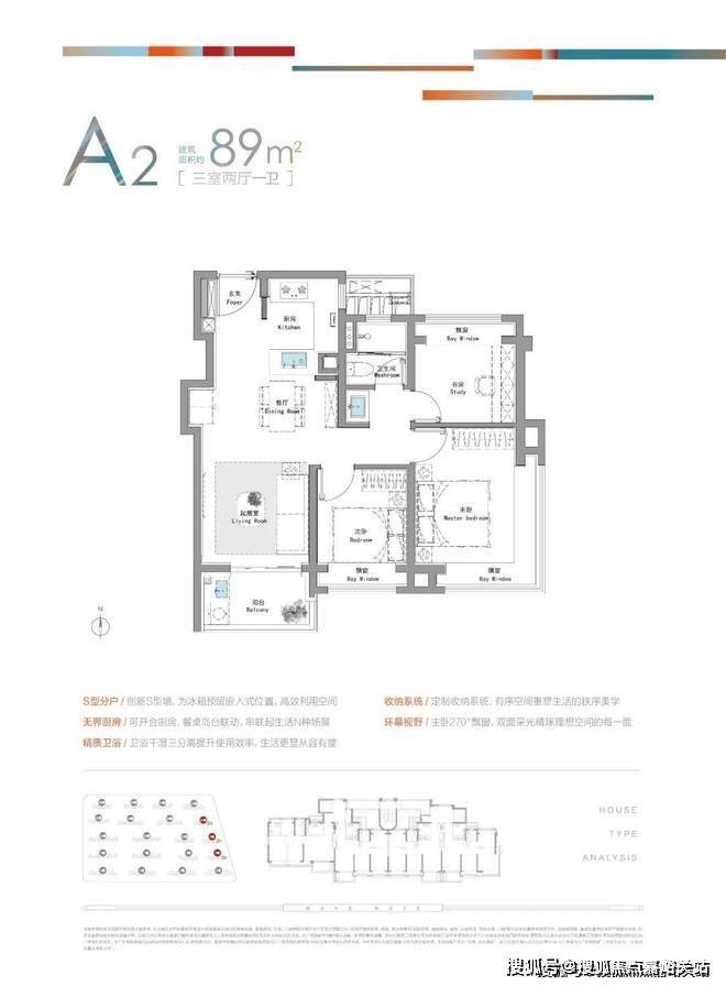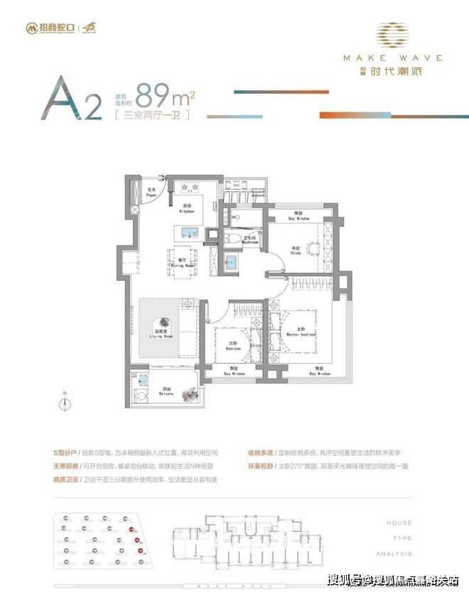 建面约89㎡3房户型:东边套主卧配置约270°双向采光飘窗、S墙设计,主力总价仅约450万级,首付约90万起!