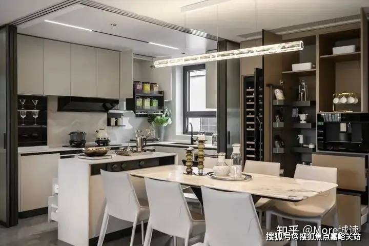 餐厨空间是家庭生活的高频使用的场域,招商时代乐章艺术化地再造传统餐厨空间,可开可合的岛台设计,结合艺术玻璃移门实现了很多项目虽有、但无法给每个户型同时都设计的半开放式厨房。